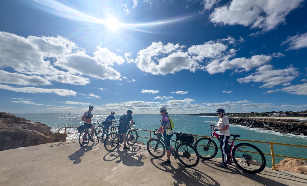 Day 2 in Geraldton today and we all had chores to get done before we set out exploring for the afternoon. Both the Scott’s and the Allen’s managed to pick up a coveted free camping spot at the foreshore which is central to everything of interest. So once we’d finished shopping Bob and I pulled the bikes off the van and rode in to meet the others. The afternoon was spent enjoying the lovely weather and riding around the points of interest in town. We saw the Yellow Submarine (a submarine designed for catching crayfish that never made it past prototype), the Big Marble, visited the historic jail (where the cells are now used as craft stalls) and finally spent a pleasant hour or so sitting overlooking the water at a 50’s style cafe.