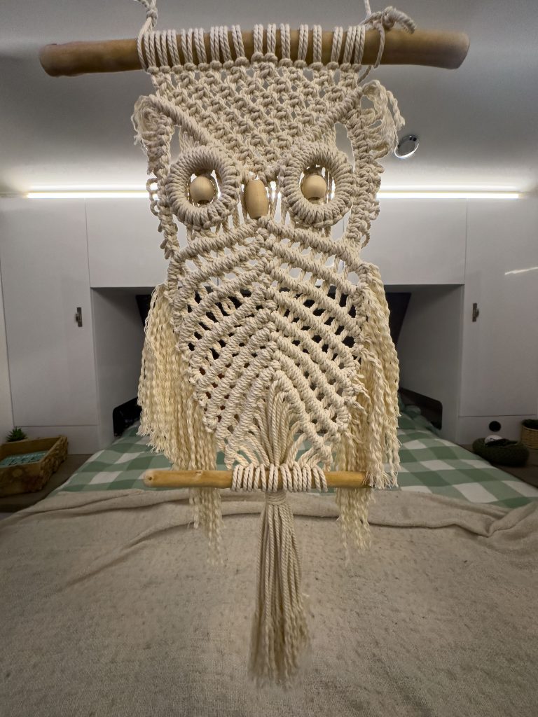 We filled our car water bladder and picked up a few groceries before heading back to Tulki Beach for our last night on the Ningaloo coast. Tonight we have continued forward bookings – we will all be largely following the same program, however have different priorities around a few locations that will mean variations in bookings. I have also finished my third macrame project for the trip. Tally so far is a knitted beanie and scarf, macrame coaster, photo frame and owl, and crocheted hanging basket and bedside knick-knack container for Bob. Marching through the supplies quite quickly 🙂 .