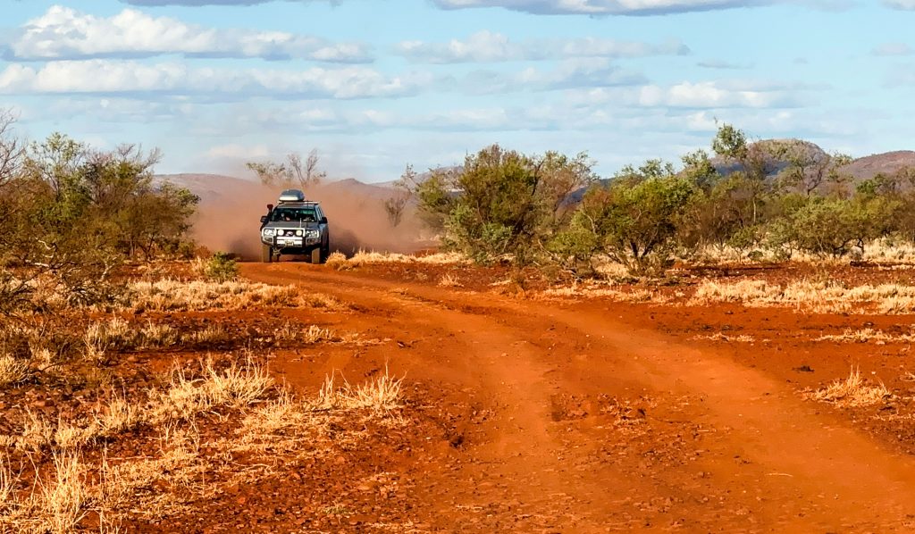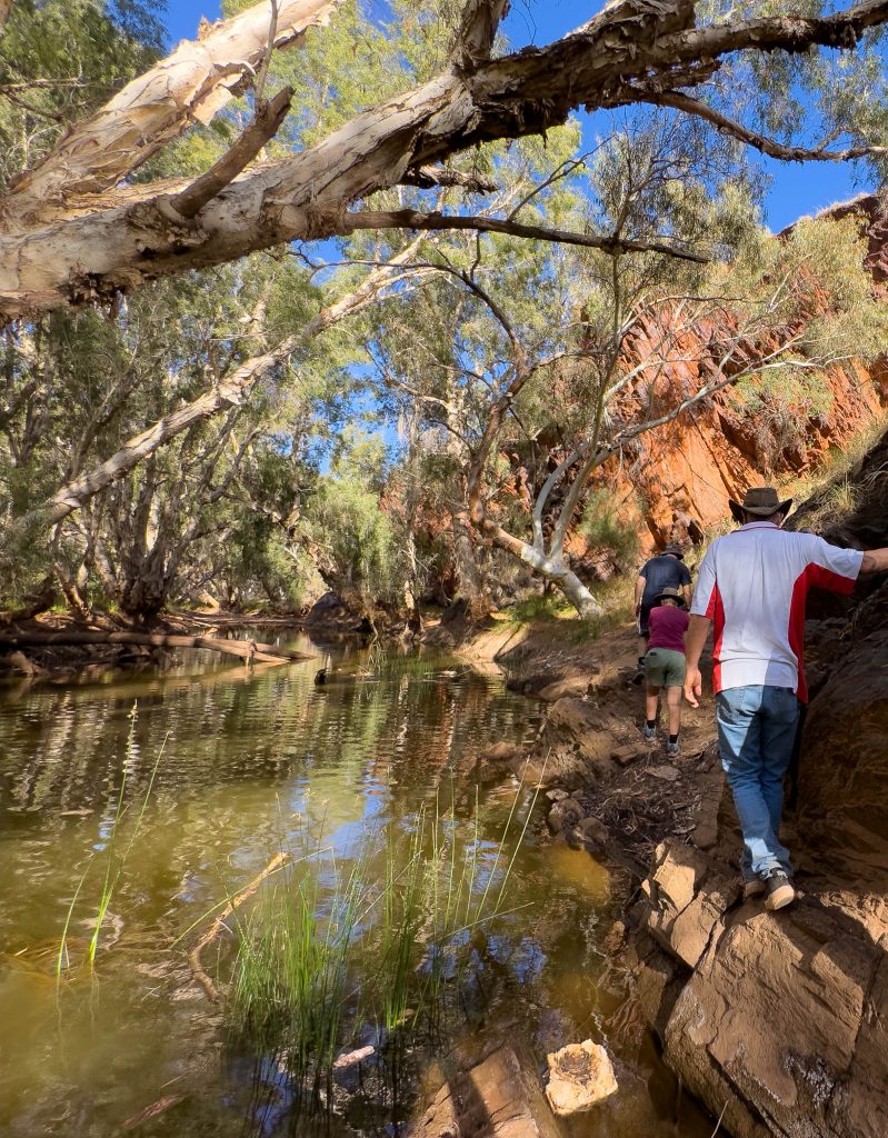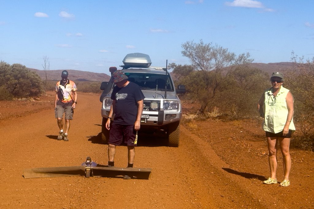 We were checked in and parked up by 1pm and left after a quick lunch to explore the adventure trail. I was given control of the wheel as I think Bob was sick of driving all morning. The trail varied between well graded gravel and very corrugated tracks. The Allen’s jumped in with the Scott’s as we have an extra 100L of water stored in the footwell in the back of the car so can’t take passengers at the moment. The first really lucky thing for the day happened when I took a turn in the lead. We had some space between us to allow the dust to settle behind me, which was also lucky. Just as we were about to turn off to our first gorge, Karen called on the radio and said our hitch was on the road! This hitch weighs a lot. It can tow up to 4.5 tonne and has the stone stomper protection system connected to it which spans the width of the car. Somehow the locking pin had come out of the hitch lock, which had then come out, which had then allowed the entire hitch to bounce out of the hitch receiver of the vehicle!