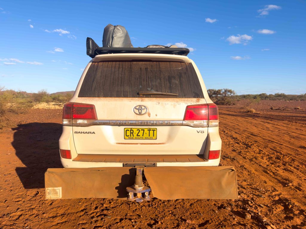We had literally no idea this had happened! Had we been in the rear we would not have discovered it was gone until at least tonight and we certainly wouldn’t have been leaving here tomorrow with 70km of exploring to retrace (and then hope that no passing traffic had taken it). Thankfully, it appeared relatively undamaged, so the 3 boys all ended up under the car and the spare hitch lock Bob carries for an emergency was deployed. We felt exceptionally lucky something worse hadn’t happened while towing….Unfortunately, we can’t find any scenario that would allow this to have occurred other than someone removing the locking pin. We did find we were missing a shackle bolt on Monday morning, so it is possible they both went at the same time and it just took a few hundred kms for everything to work lose.