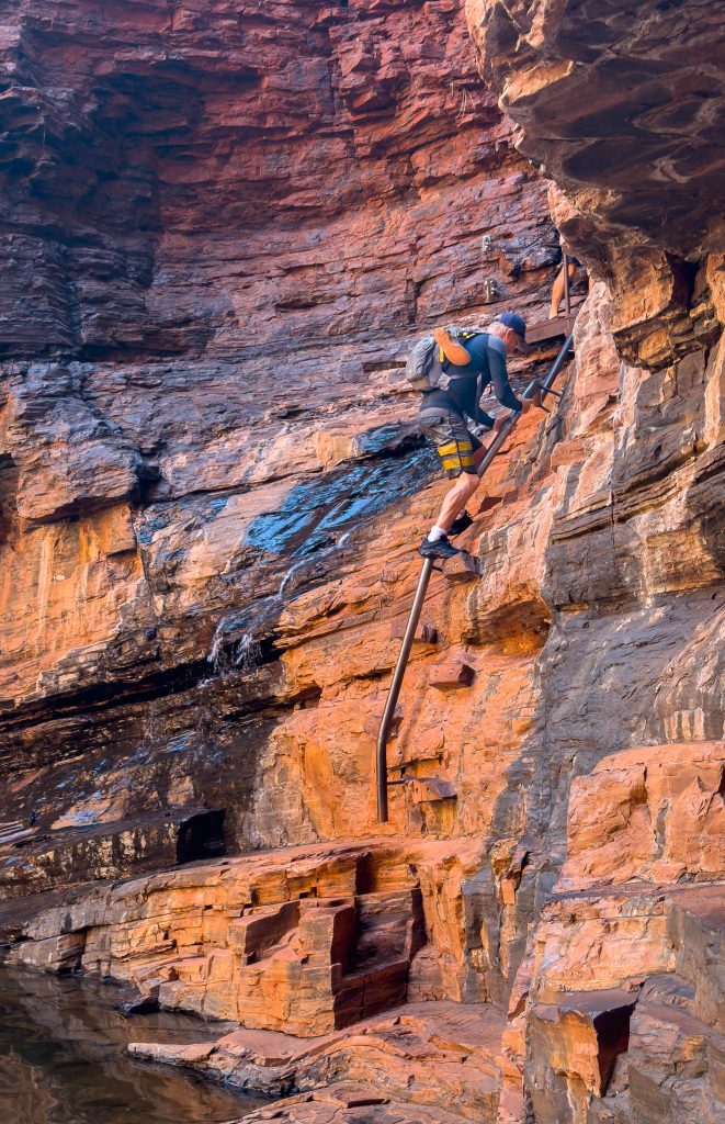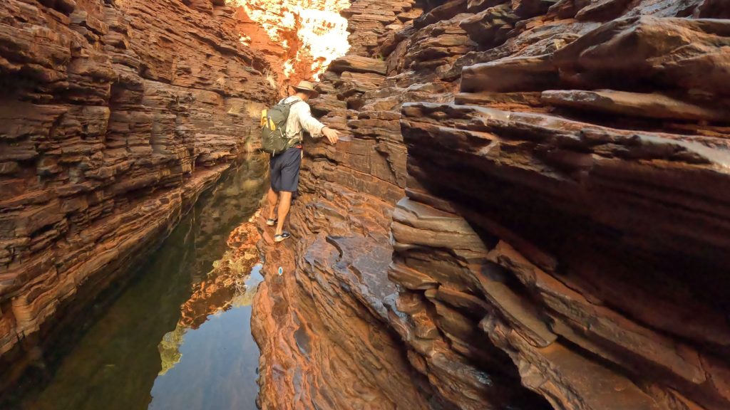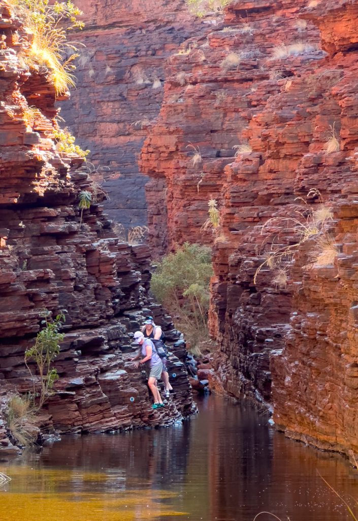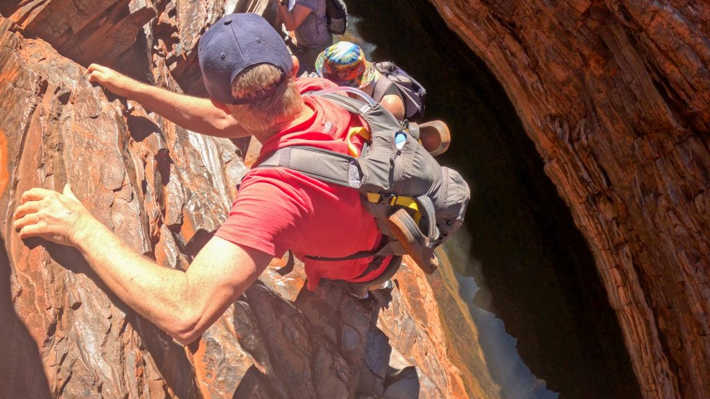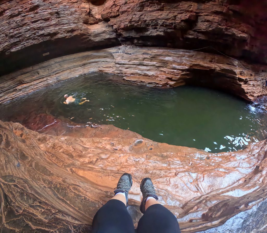 Today was another full one. Sorry but there may be too many photos. First stop was Hancock Gorge where we embarked on a much shorter (than Mount Bruce) Class 5 hike to go through the gorge. We scrambled over large rocks, scaled vertical walls over the water and eventually found ourselves at Kermit’s Pool. The water was unbelievably cold here. I wore my GoPro on my head cause I couldn’t hold a phone while doing this and got some ‘action’ shots 🙂 .