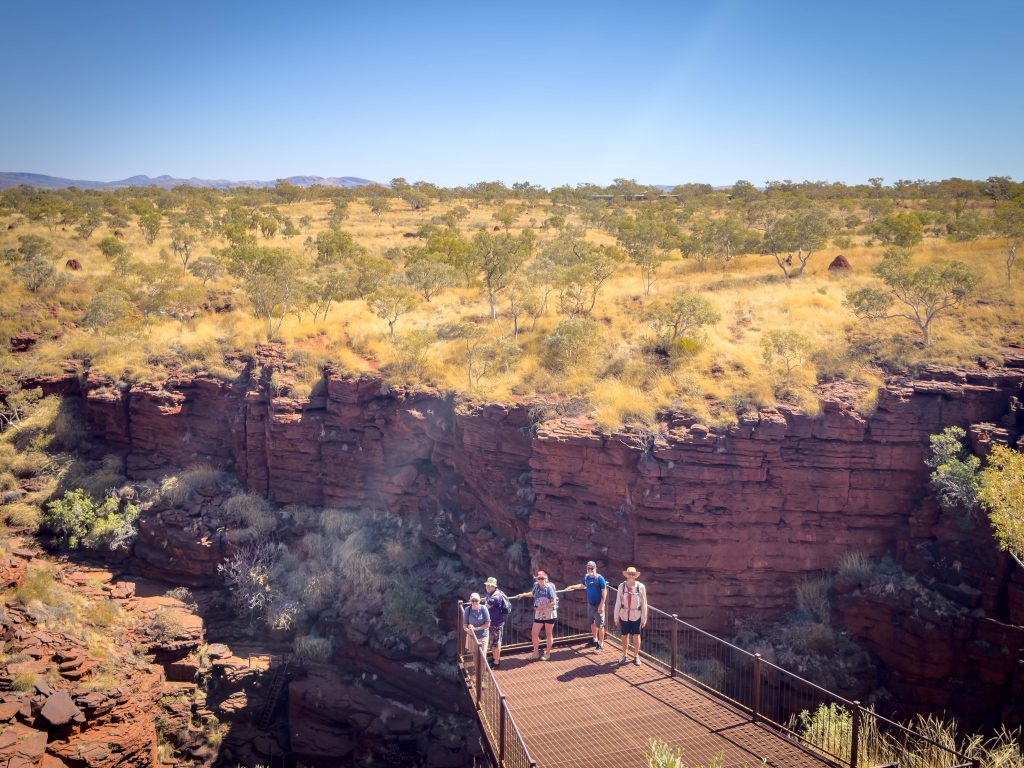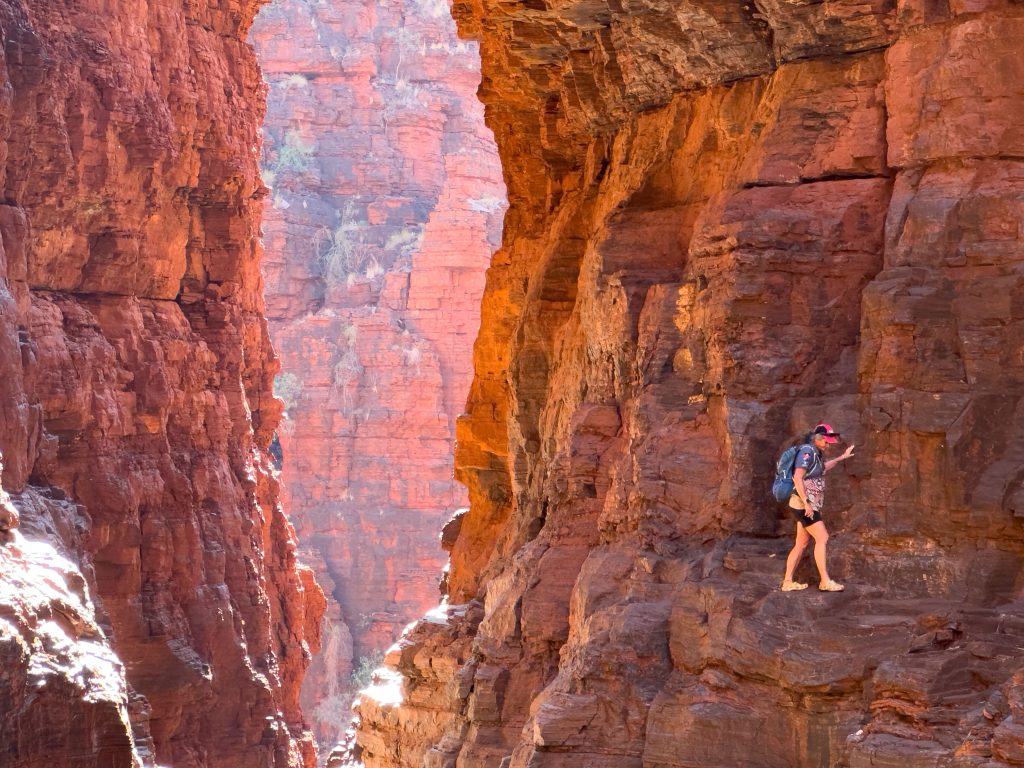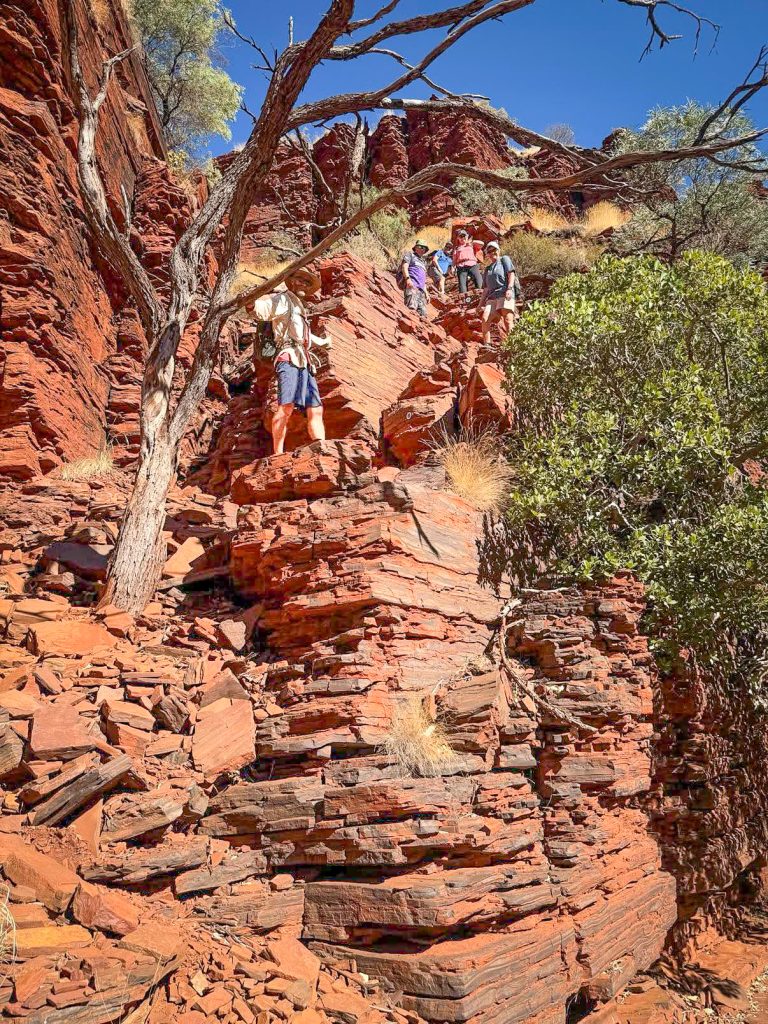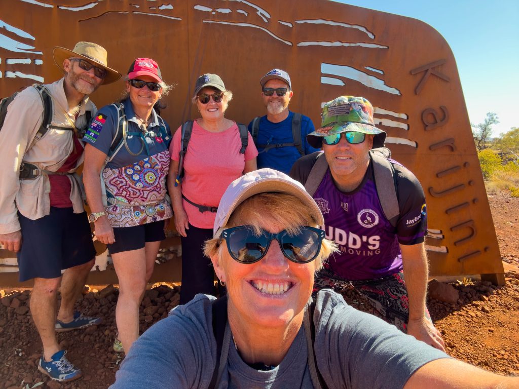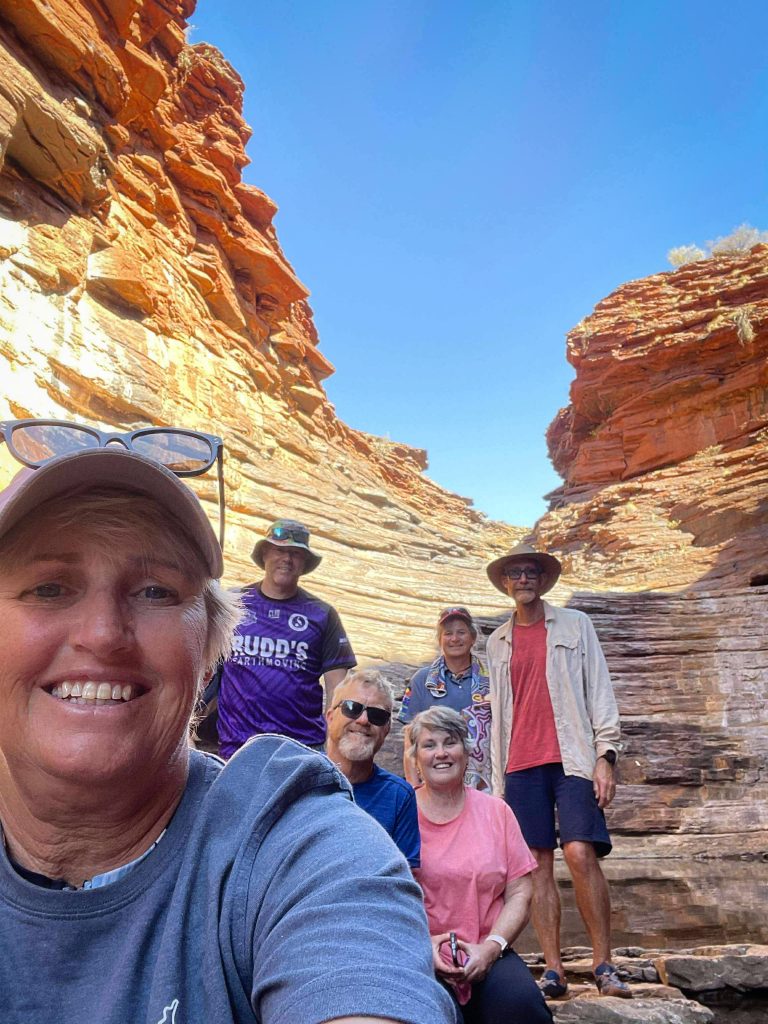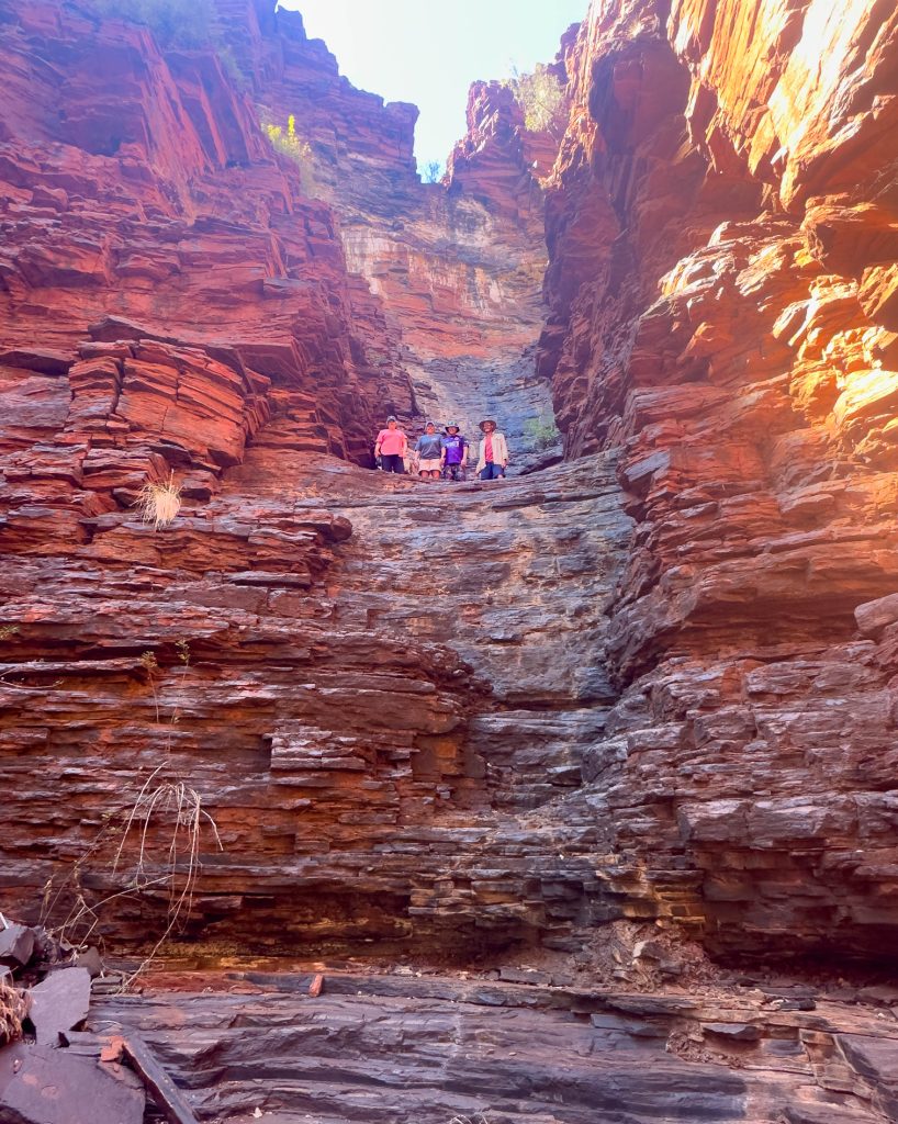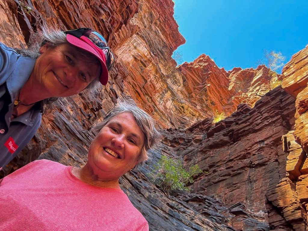 Today was our last day in Karijini. It’s been such an incredible week. Huge variety in the gorges and rock formations, and I think I can honestly say I have never hiked the elevations we have achieved this week in my life – some on steps, some on ladders, and lots scrambling and pulling up over rocks. Happily, I don’t have any sore muscles. I am feeling fatigued though and looking forward to some downtime (maybe) as we move on to our next locations. Note to self: even spent knees can do amazing things! Today, there were a couple of locations that I simply couldn’t traverse on my own. Thanks to Jason for propelling me up those spots that needed a little jet fuel.
