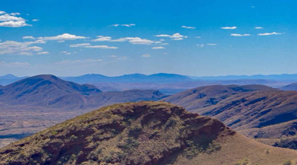 Then it was 100km to Tom Price to restock the pantry and fuel the car. While there we found our spider friend had jumped a lift to town in our shoe box. We also bumped back into the Scott’s and arranged to jump into their car to head up the 4wd only track to Mount Nameless – which has the highest ‘road’ in WA overlooking Tom Price. The track up was certainly 4wd only. 100% Bob and I would have turned around at the bottom. Kieran seemed to enjoy the drive…