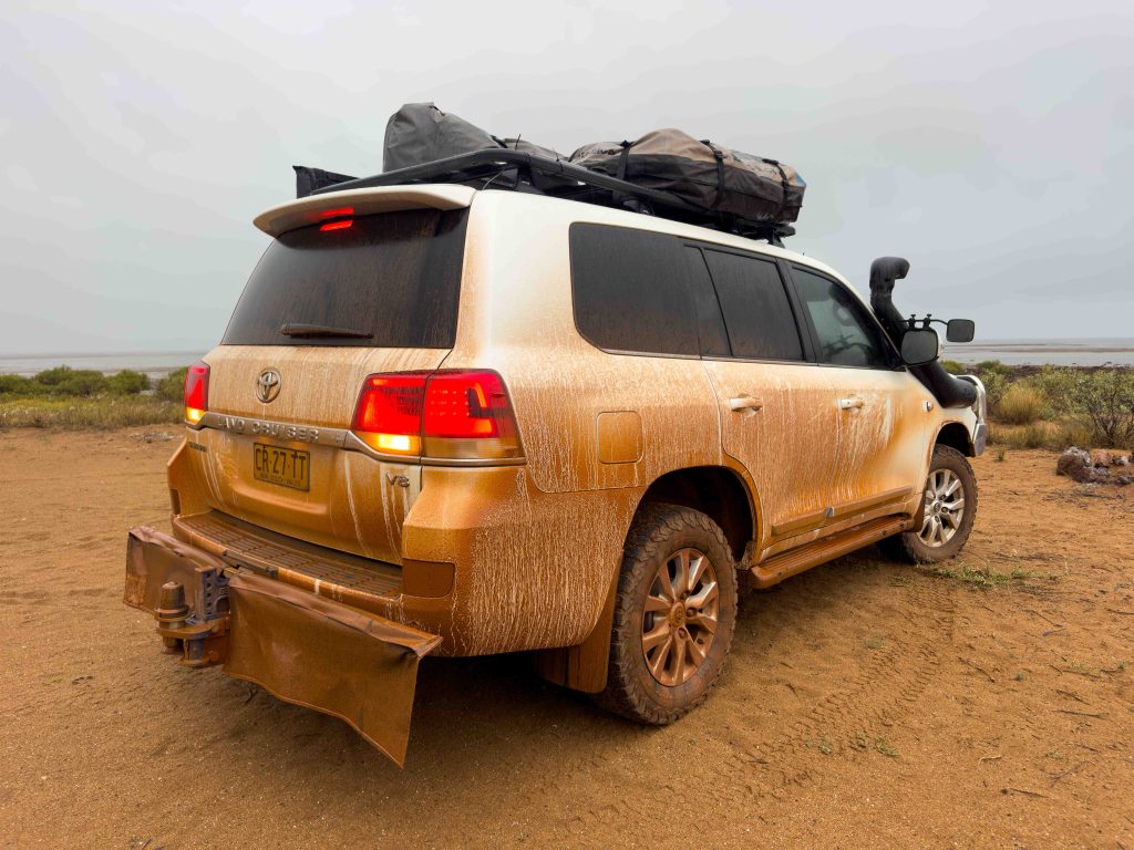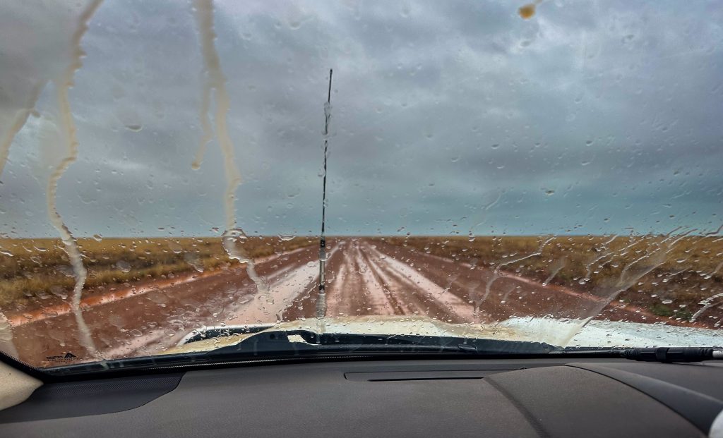 Really not what we were expecting after about 5mm of rain that we had driven through on the way back. And clearly not applicable to us, as our homes-on-wheels were sitting at the other end of the road with everything we need to exist. So Bob took a deep breath and with Kieran (who knows 4wding) and me (who knows wet corrugated roads from living on a property in her teens) giving largely complementary advice for getting back to camp along the road 🙂 .