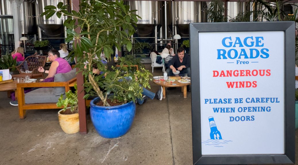 After spending a lovely morning perusing markets and the museum, we headed over to the Gage Roads brewery for a light lunch. We almost got blown over walking there – wind gusts today at Fremantle exceeded 90km/hr. The wind has been beyond belief! Luckily we got a seat adjacent to the fire and a pleasant hour or so was spent out of the weather.