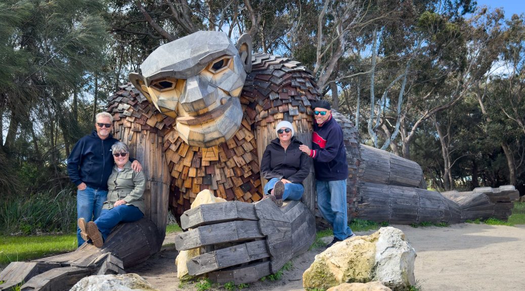 Then it was off to start our path around the Mandurah Giants. These are very impressive artworks dotted around the Mandurah area with a story and challenge built in to finding them. There are 6 in total, but with our time restraints today we could only manage to find 3. Bob is a convert…..from not having any interest in seeing them when he first heard of them, he has commented this evening that it would have been great to do them with the kids when they were young. There are other giants installed around the world from the same artist. So clever.
