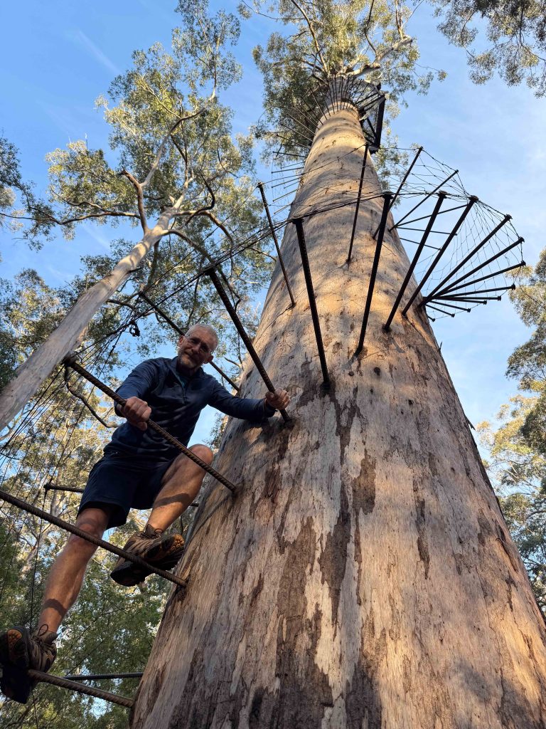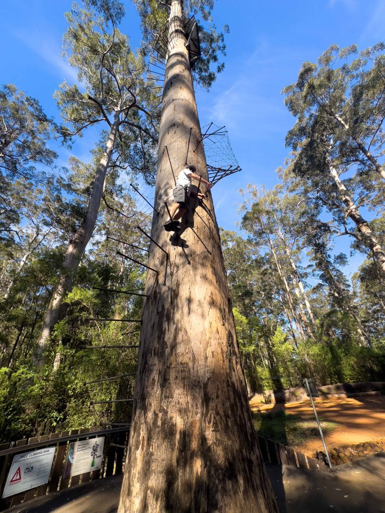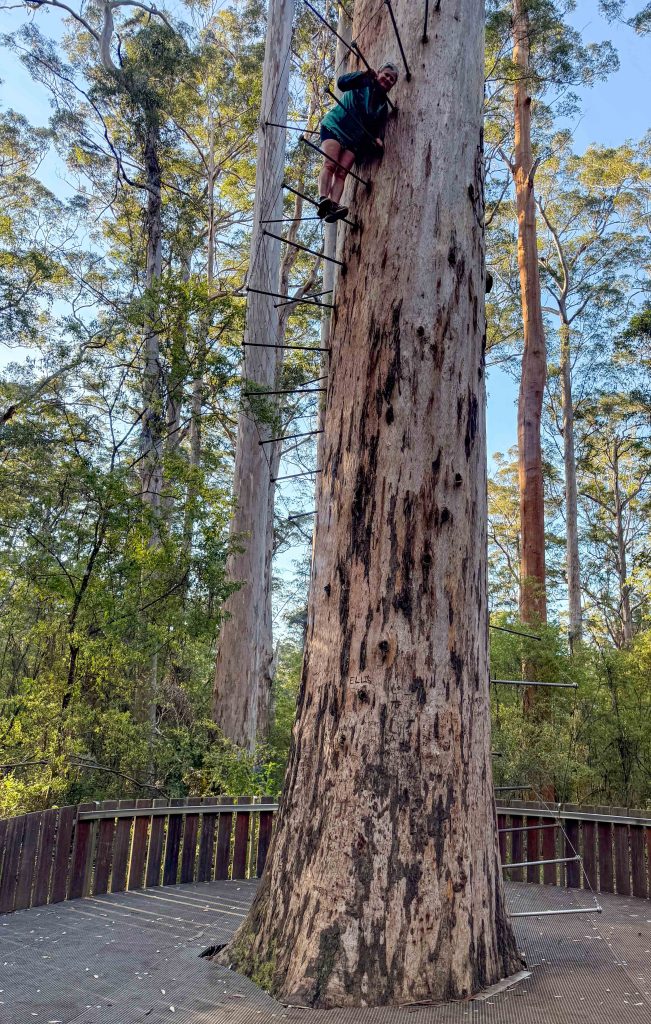 Then it was through to the Bicentennial tree which we all had a go at climbing. I was the only one to make it to the designated turn around point (about 30m up the tree), and I even did it twice as I left my phone with Bob but decided I wanted some photos from up there….