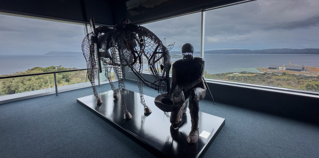 We then battled the wind and walked back to the vans and relocated to the ANZAC Discovery Centre. The first troop convoy of Australian and New Zealand ships set off from the port of Albany. The centre is very modern with self guided listening stations. We were all given a person when we arrived and we followed their individual war story along the way. It was well done and we spent over 2 hours here. I really enjoyed reading about the transport of the horses. Only one of the thousands that were sent over was brought back to Australia and his hoof was mounted at the centre. The elevated views from the building over the water were incredible when you could actually see them.