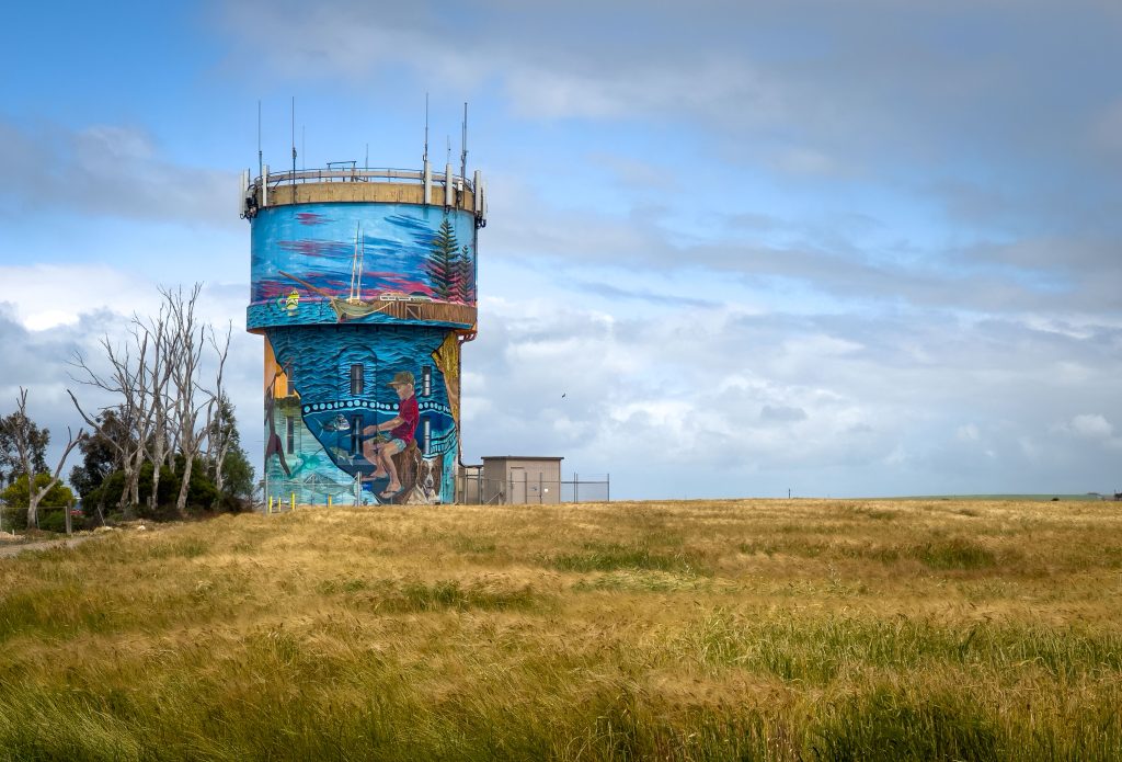After 5 days of sightseeing on the Yorke Peninsula, the wind got the better of us today and we blasted from the bottom end straight out the top, jet propelled by the gale force winds behind us. We called in to Port Vincent for the water tank mural art photo before stopping for coffee and a pie at the bakery at Ardrossan.